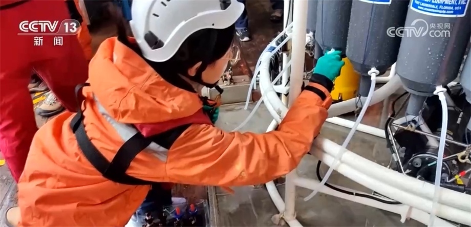 中國第13次北冰洋科學考察隊隊員 王穎:我們主要采的是溶解氧和DIC(溶解無機碳),溶解氧是為了測定海水中的氧氣含量,氧氣對海洋中生物的繁殖(生存)是非常有必要的。DIC(溶解無機碳)主要是為了測海洋中的溶解態(tài)的無機碳,要關(guān)注海洋中的碳的平衡。