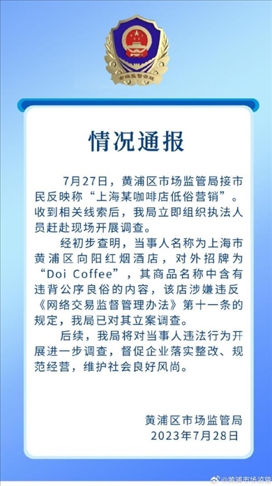 ·上海黃浦通報(bào)“咖啡店低俗營(yíng)銷”:違背公序良俗,已立案調(diào)查。