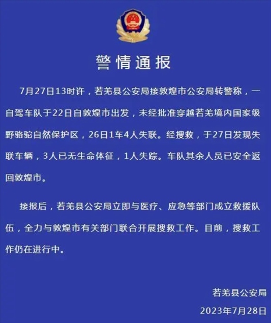 ·新疆若羌縣警方通報(bào)一車隊(duì)未經(jīng)批準(zhǔn)穿越自然保護(hù)區(qū):3人無生命體征,1人失蹤。