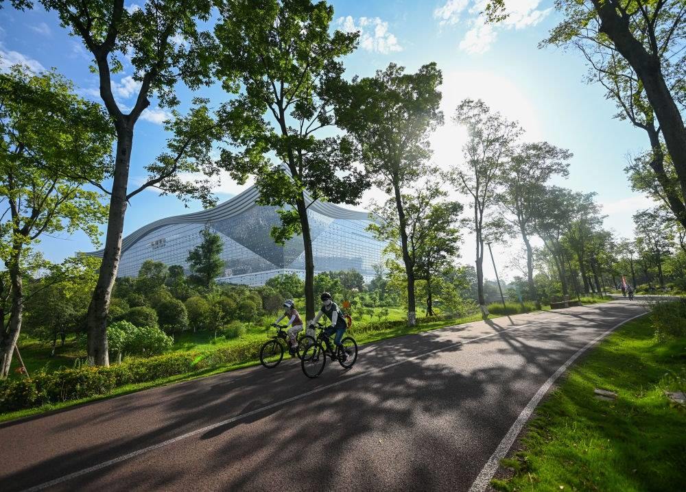 人們在成都高新區(qū)桂溪生態(tài)公園騎行。