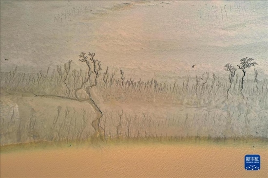 近日,隨著黃河調(diào)水調(diào)沙結(jié)束,黃河河南省開(kāi)封市黑崗口險(xiǎn)工段水位下降。河床被水流沖刷過(guò)后呈現(xiàn)出縱橫交錯(cuò)的“脈絡(luò)”。