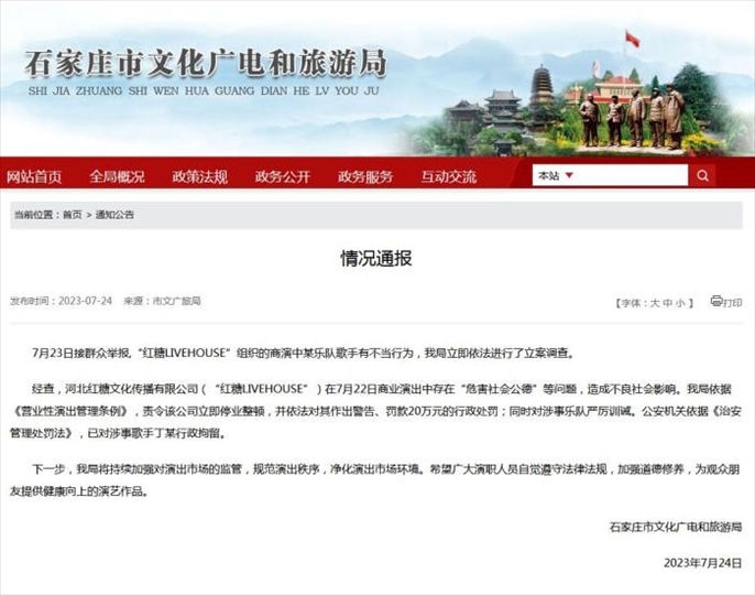·石家莊通報(bào)樂(lè)隊(duì)歌手商演不當(dāng)行為:涉事者被拘,公司停業(yè)整頓。