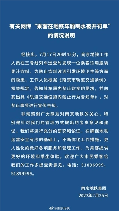 ·南京地鐵通報(bào)女子喝水被開(kāi)罰單:系果汁,依規(guī)出具告知單。