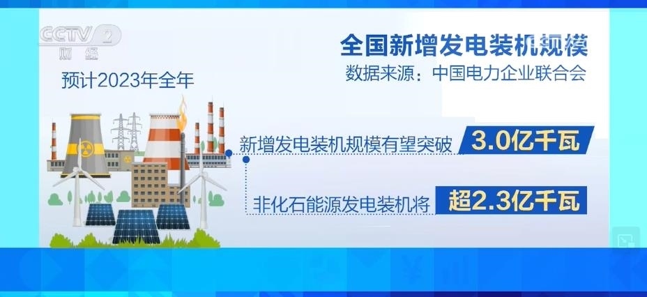 據(jù)預(yù)計(jì),2023年全年,全國(guó)新增發(fā)電裝機(jī)規(guī)模有望突破3.0億千瓦,其中,非化石能源發(fā)電裝機(jī)將超過(guò)2.3億千瓦。到2023年底,全國(guó)發(fā)電裝機(jī)容量預(yù)計(jì)將達(dá)到28.6億千瓦,同比增長(zhǎng)11.5%左右。其中,并網(wǎng)風(fēng)電和太陽(yáng)能發(fā)電合計(jì)裝機(jī)容量將達(dá)到9.6億千瓦,占總裝機(jī)的三分之一。