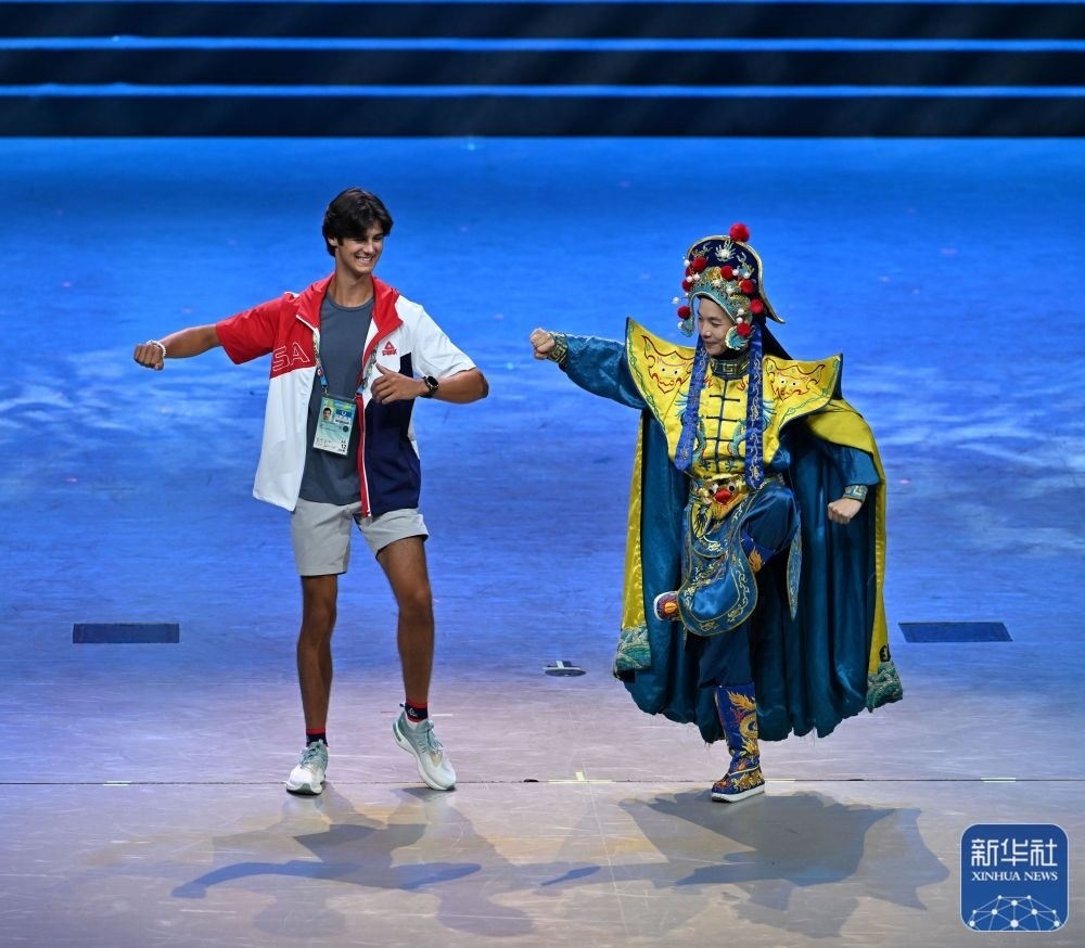 ↑7月29日,美國(guó)運(yùn)動(dòng)員杜恩(左)在聯(lián)歡會(huì)現(xiàn)場(chǎng)與川劇演員互動(dòng)。新華社記者 蔡湘鑫 攝