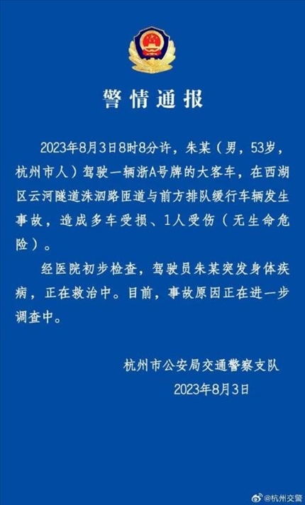 ·杭州警方通報(bào)大客車(chē)隧道與多車(chē)相撞:客車(chē)駕駛員突發(fā)疾病。
