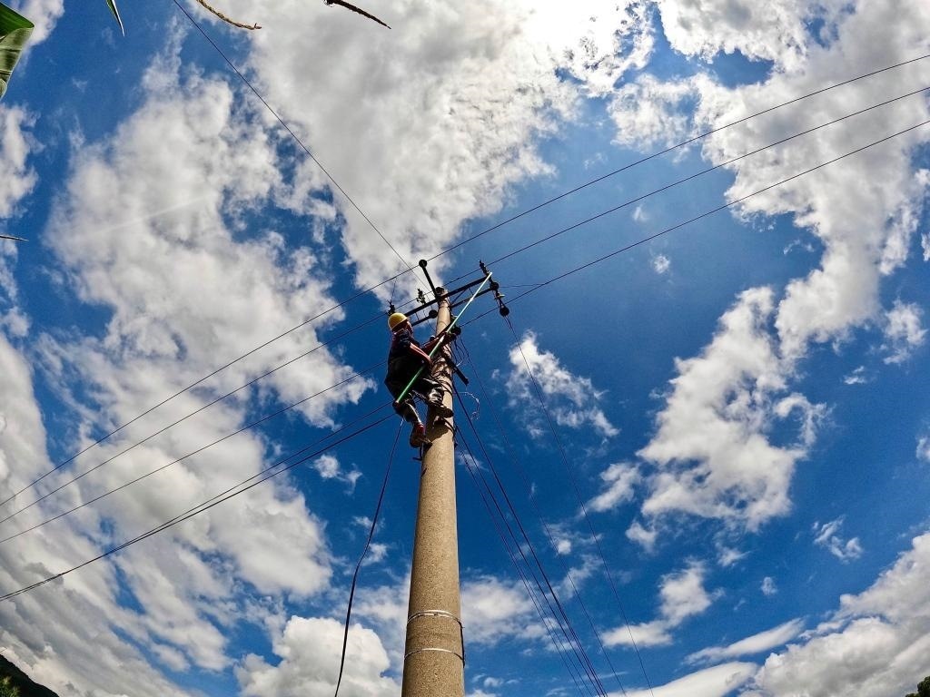 8月5日,電力搶修人員在進行作業(yè)。(王潤澤 攝)