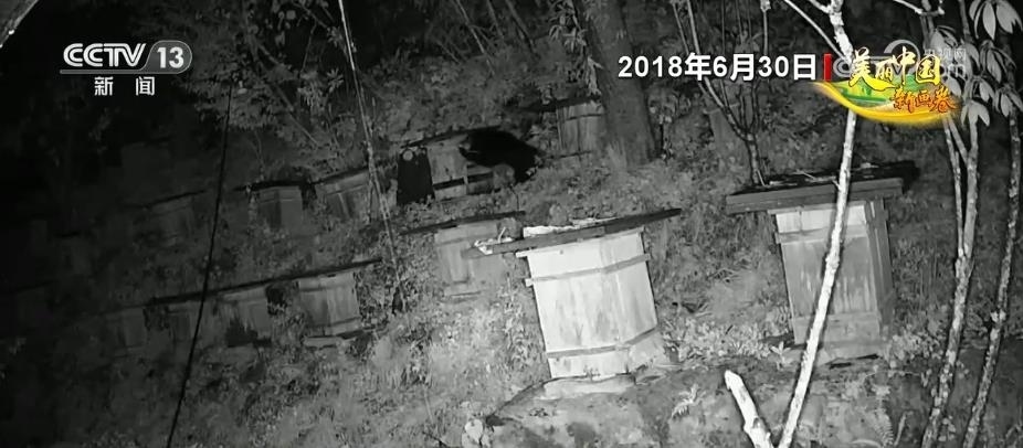 在湖北堵河源國家級自然保護區(qū),經(jīng)常會發(fā)生黑熊下山偷食百姓的莊稼、蜂蜜等農(nóng)產(chǎn)品。記者通過當?shù)匾晃淮迕裉峁┑囊曨l看到,2018年晚上一頭成年黑熊來到一蜂箱放置點,黑熊為了取食蜂蜜推倒了一箱蜂箱,并啃食了幾口蜂蜜。