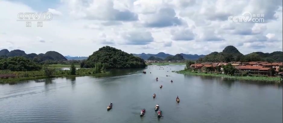 在云南普者黑,萬畝荷塘花開正盛,游人不僅可以泛舟賞荷嬉戲,還能進入當?shù)貪O村感受彝族撒尼人生活文化和非遺技藝。