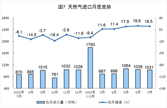 1—7月份,生產(chǎn)天然氣1340億立方米,同比增長5.7%。進口天然氣6688萬噸,同比增長7.6%。