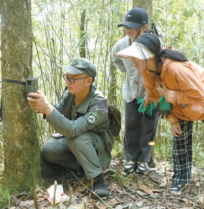 四川大相嶺大熊貓野化放歸研究基地巡護(hù)員在安裝調(diào)試紅外線相機(jī)。楊愛玲攝