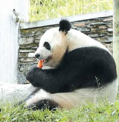 中國臥龍大熊貓繁育中心里的大熊貓?jiān)谶M(jìn)食。 孫信志攝