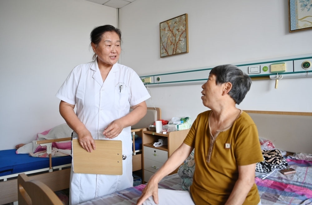 醫(yī)務(wù)人員在海福祥養(yǎng)老護(hù)理院安置點(diǎn)內(nèi)叮囑轉(zhuǎn)移老人用藥(8月9日攝)。新華每日電訊記者李然攝