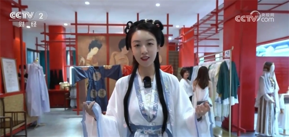 總臺(tái)央視記者 劉藝涵:沉浸式古鎮(zhèn)之旅一定少不了換裝體驗(yàn),也是不少游客來(lái)到這里首選的項(xiàng)目。目前,園區(qū)內(nèi)像這樣的古裝店共有7家,提供租賃、銷(xiāo)售、化妝造型和攝影等服務(wù)?,F(xiàn)在我身上的這件就是店里的一款經(jīng)典的漢服,全天的租賃價(jià)格是199元。