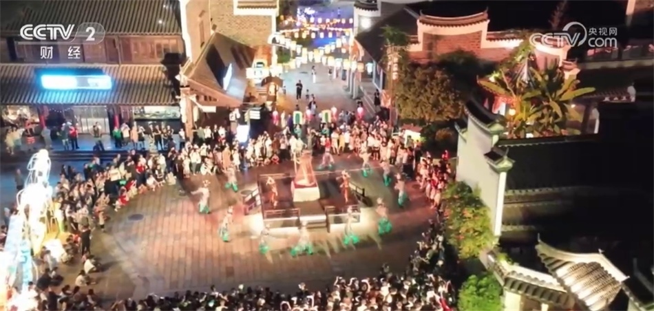 總臺(tái)記者 姜文婧:大家看我的身邊現(xiàn)在已經(jīng)聚集了很多人,行進(jìn)式的情景演出《無(wú)夢(mèng)到銅官》已經(jīng)開(kāi)始了。整場(chǎng)演出都在移步換景中完成,依托古鎮(zhèn)建筑群、街道和各個(gè)打卡裝置,營(yíng)造出漢唐風(fēng)的市井繁華景象,讓游客身臨其境,還可以與演員互動(dòng)。