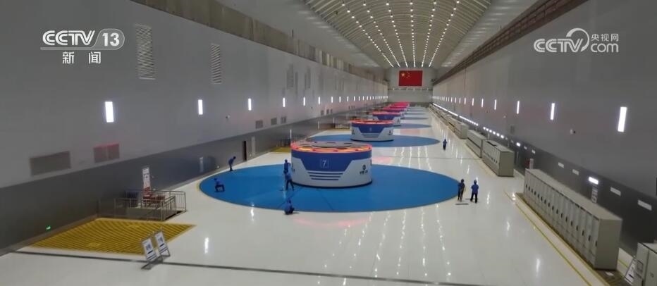 我現在就在白鶴灘水電站的左岸地下廠房,在我身后一字排開的,就是處于全發(fā)狀態(tài)當中的百萬千瓦水輪發(fā)電機組。站在這兒,我其實只能看到它冒出地面的3米,而在我腳下還有51米,單臺機組的總重量接近8000噸。之所以讓它成為世界級的先進的水輪發(fā)電機組,除了它的這種大體量和大功率之外,更重要的是在研發(fā)階段解決了許多世界級的難題。比如,它所克服的特殊工況下的壓力脈動,就能夠讓整臺機組在運行的時候更加的安全、穩(wěn)定。再比如說,在機組高速運轉的過程當中,對于平穩(wěn)性的要求近乎于苛刻,我現在就站在機組的頂板上,在地面上立了幾枚硬幣,它們現在是穩(wěn)穩(wěn)地立在這兒,但是如果我輕輕的施加外力,它就會傾倒,看得出來它的平穩(wěn)性。而正是一代又一代的中國水電人的不斷努力,才實現了水輪發(fā)電機組從跟跑到并跑到超越的發(fā)展速度。鑄造出了這樣的國之重器。