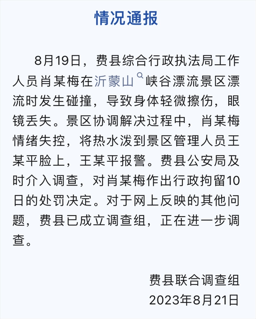 ·山東費(fèi)縣行政執(zhí)法局一副局長(zhǎng)家屬向景區(qū)員工連潑3杯熱水,被行政拘留10日。