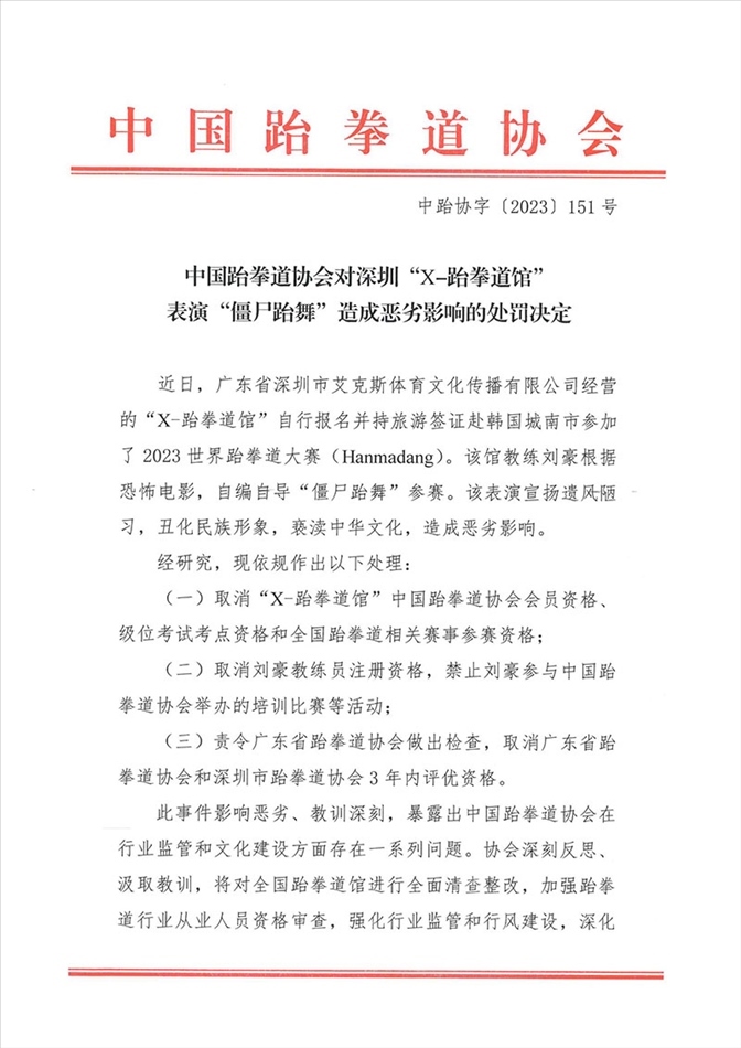 ·在韓表演“僵尸跆舞”跆拳道館被中國(guó)跆拳道協(xié)會(huì)處罰:取消會(huì)員和賽事參賽資格。