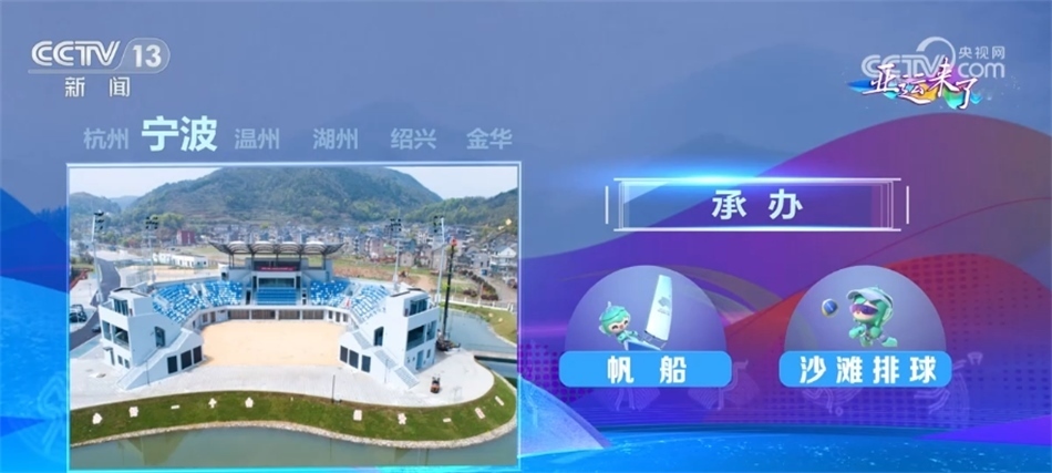 寧波設(shè)2個場館和1個亞運(yùn)分村,承辦帆船和沙灘排球項目;溫州設(shè)3個場館和1個亞運(yùn)分村,承辦足球小組賽和龍舟項目;湖州設(shè)2個競賽場館,承辦排球和三人制籃球項目;紹興設(shè)4個場館,承辦籃球、排球、攀巖、棒壘球項目;金華設(shè)3個場館和1個亞運(yùn)分村,承辦足球小組賽和藤球項目。
