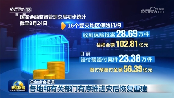 國家金融監(jiān)督管理總局初步統(tǒng)計,截至8月24日,16個受災地區(qū)保險機構收到保險報案28.69萬件,估損金額102.81億元。目前賠付預賠付案件23.38萬件,賠付預賠付金額56.39億元。