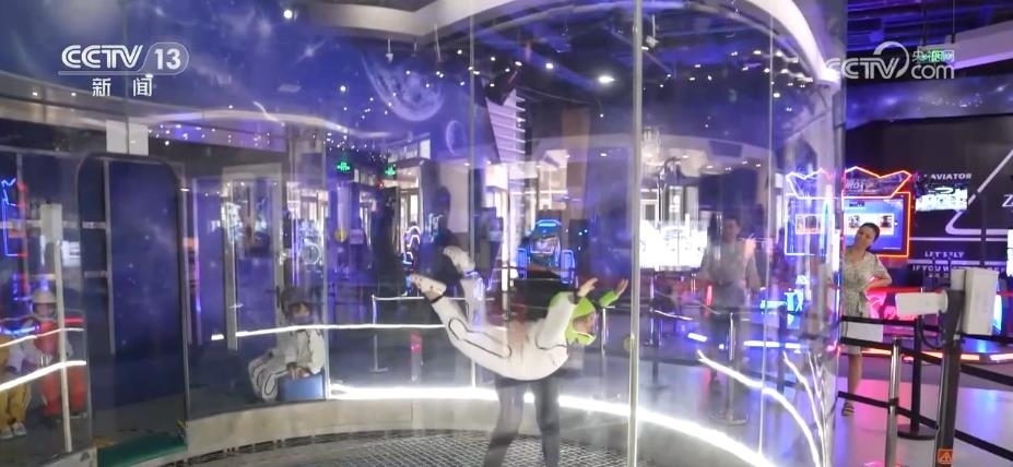 腹部朝下、身體張開(kāi)、雙腿繃直,在完成這樣一個(gè)標(biāo)準(zhǔn)的飛行動(dòng)作后,就可以在這個(gè)空洞中平穩(wěn)飛升到10多米高的空中,模擬體驗(yàn)跳傘的感覺(jué)。