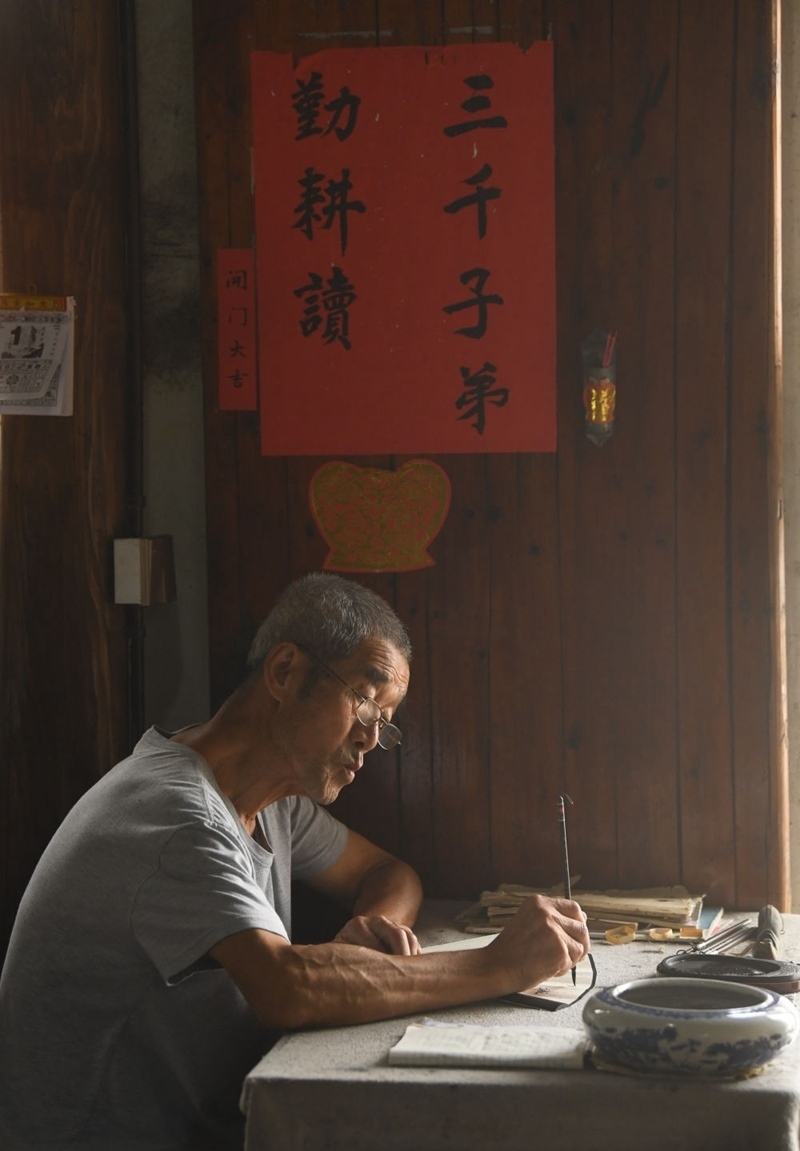 時(shí)值暑期,村民諸葛品余每天會(huì)在自家沿街的鋪面里打開(kāi)扇面,謄寫(xiě)諸葛亮的《誡子書(shū)》《出師表》,路過(guò)的孩童不時(shí)張望,有的干脆走進(jìn)屋里,跟著背誦起來(lái)。一件折扇紀(jì)念品,承載著傳統(tǒng)村落厚重的文化。