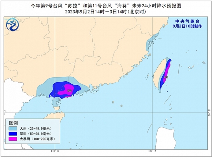 降水預(yù)報(bào):9月2日14時(shí)至3日14時(shí),受“蘇拉”和“海葵”影響,廣東西南部、廣西東南部、福建東北部沿海、臺(tái)灣島東部等地有大到暴雨,其中,廣東西南部、臺(tái)灣島東部等地部分地區(qū)有大暴雨(100~220毫米)。