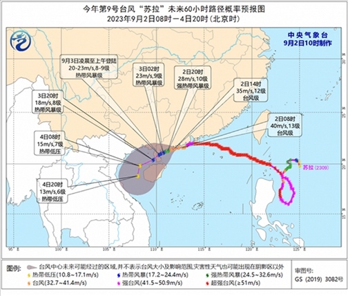 另外,今年第9號臺(tái)風(fēng)“蘇拉”的中心今天(9月2日)上午8點(diǎn)鐘位于廣東省臺(tái)山市近海,就是北緯21.6度、東經(jīng)112.7度,中心附近最大風(fēng)力有13級(40米/秒),中心最低氣壓為960百帕。