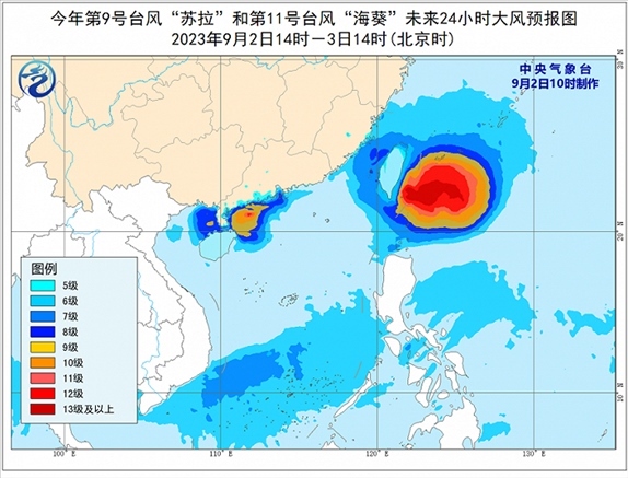 大風(fēng)預(yù)報(bào):9月2日14時(shí)至3日14時(shí),受“蘇拉”影響,南海西北部、北部灣東部、瓊州海峽及廣東中西部沿海、廣西南部沿海、海南北部沿海、珠江口以及香港和澳門等地將有6-8級、陣風(fēng)9-10級的大風(fēng),“蘇拉”中心經(jīng)過的附近海面或地區(qū)風(fēng)力有11-12級、陣風(fēng)13-14級;受“??庇绊懀_(tái)灣海峽、巴士海峽、浙江南部沿海、福建沿海、廣東東部沿海、臺(tái)灣島沿海將有6-8級,陣風(fēng)9-10級大風(fēng),臺(tái)灣以東洋面部分海域風(fēng)力可達(dá)9-12級,陣風(fēng)13-14級,“??敝行慕?jīng)過的附近海面風(fēng)力可達(dá)13-16級,陣風(fēng)17級及以上。