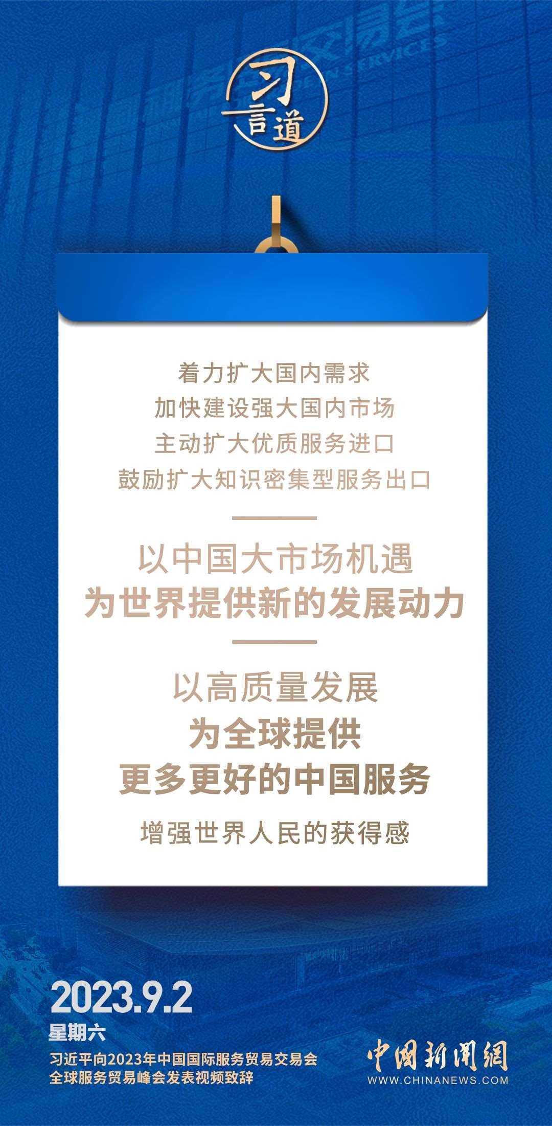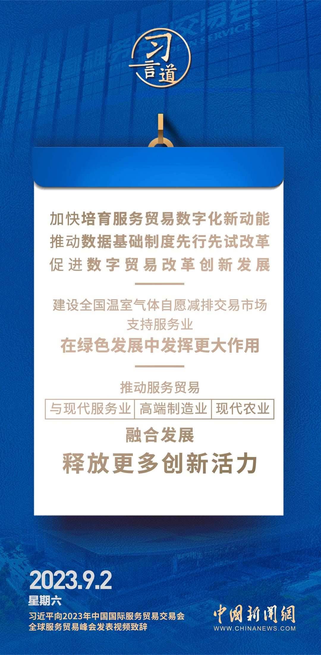 9月2日上午,國家主席習近平在北京向2023年中國國際服務(wù)貿(mào)易交易會全球服務(wù)貿(mào)易峰會發(fā)表視頻致辭。習近平指出——