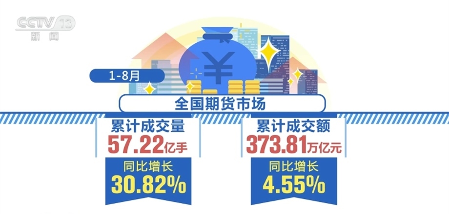 中國期貨業(yè)協(xié)會(huì)數(shù)據(jù)顯示,8月全國期貨市場(chǎng)成交量為9.49億手,成交額為60.67萬億元,同比分別增長(zhǎng)47.76%和23.49%,環(huán)比分別增長(zhǎng)15.38%和18.92%。