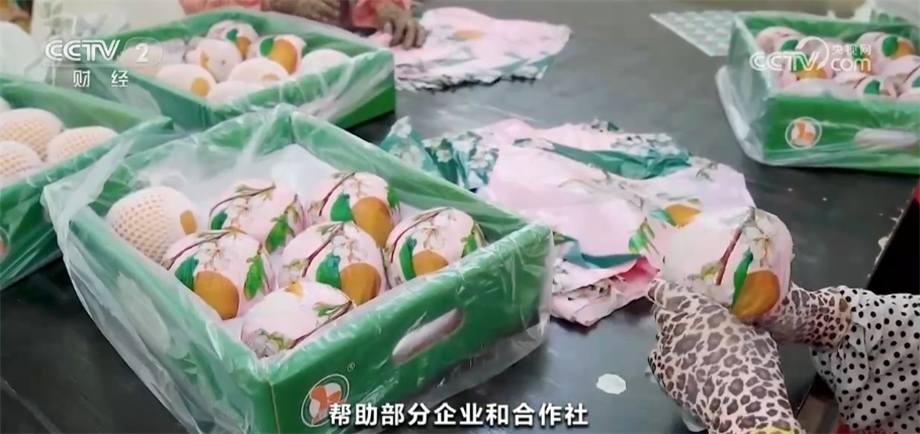 在當(dāng)?shù)匾患液献魃?,記者看到,工人們正在分揀果子,套袋裝箱,這些秋月梨將銷往全國各地。