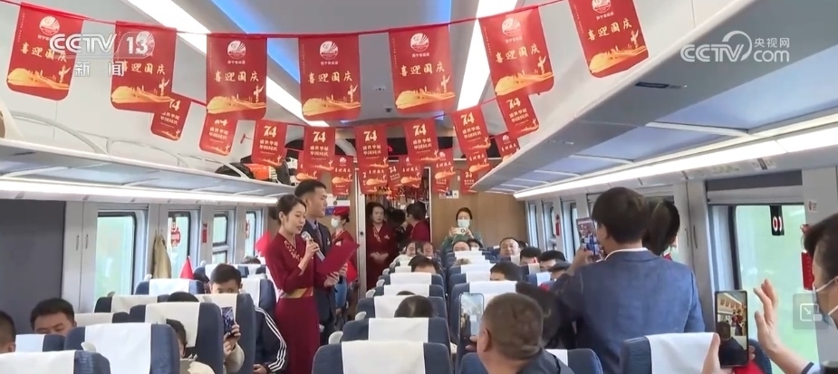 車廂內(nèi)掛滿了國慶主題的旗幟、窗花,“天路格?;ā蔽乃囆》株?duì)揮動(dòng)著手中的五星紅旗,與旅客齊聲合唱《我和我的祖國》,還表演了詩朗誦、快板等節(jié)目,贏得了現(xiàn)場旅客的掌聲。