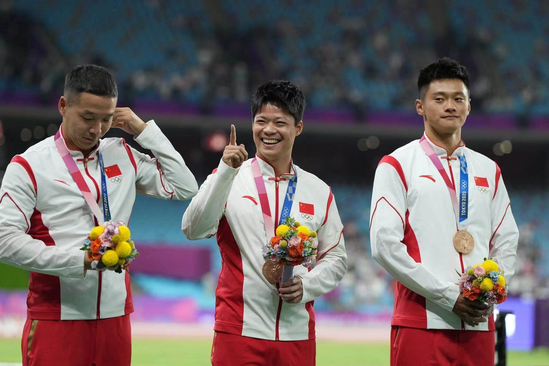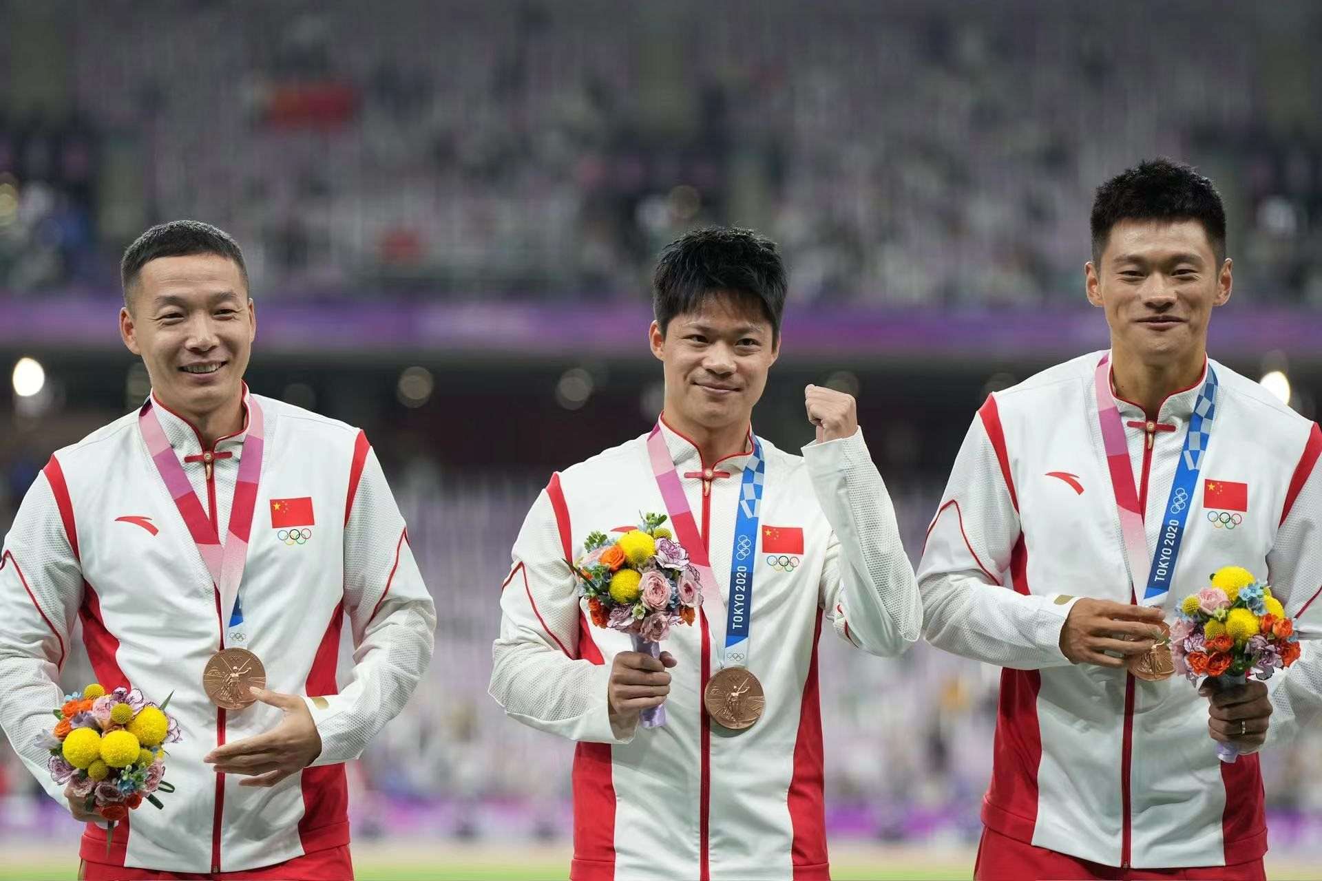 蘇炳添、謝震業(yè)、吳智強(qiáng)、湯星強(qiáng)參加了東京奧運(yùn)會(huì)田徑男子4×100米接力決賽,并在比賽中第四個(gè)沖過終點(diǎn)。去年2月,國際體育仲裁法庭裁定英國運(yùn)動(dòng)員烏賈在東京奧運(yùn)會(huì)期間違反了反興奮劑條例,取消英國隊(duì)男子4x100米接力成績并收回所獲銀牌,中國男子4x100米接力隊(duì)因此遞補(bǔ)獲得銅牌。這是中國男子4x100米接力隊(duì)首次在奧運(yùn)會(huì)上獲得獎(jiǎng)牌。