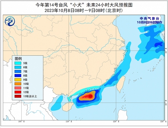 央視網(wǎng)消息:據(jù)中央氣象臺網(wǎng)站消息,中央氣象臺10月8日早上繼續(xù)發(fā)布臺風黃色預警:預計今年第14號臺風“小犬”繼續(xù)以時速低于10公里的速度緩慢向西移動,強度較昨日同時刻略有減弱(15級降至14級),仍為強臺風強度。未來“小犬”的強度還會繼續(xù)減弱,并逐漸向廣東西部到海南島東部一帶沿??拷?。