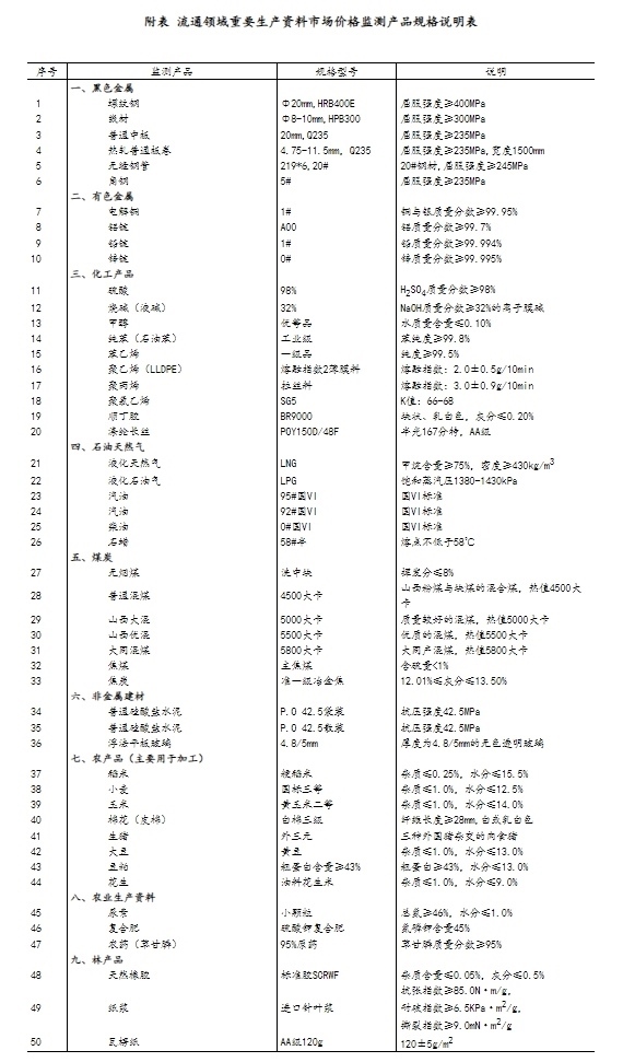 流通領(lǐng)域重要生產(chǎn)資料市場價格監(jiān)測內(nèi)容包括9大類50種產(chǎn)品的價格。類別與產(chǎn)品規(guī)格說明詳見附表。