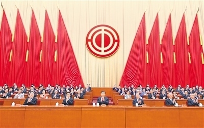 10月9日,中國(guó)工會(huì)第十八次全國(guó)代表大會(huì)在北京人民大會(huì)堂開幕。習(xí)近平、趙樂際、王滬寧、蔡奇、丁薛祥、李希等在主席臺(tái)就座,祝賀大會(huì)召開。新華社記者 申 宏攝