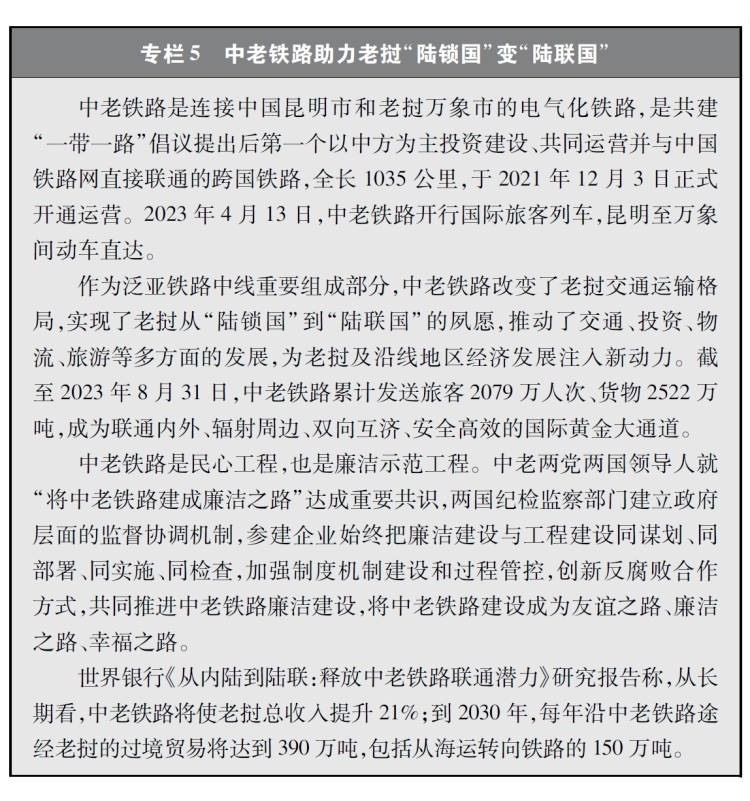 經(jīng)濟(jì)走廊和國(guó)際通道建設(shè)卓有成效。共建國(guó)家共同推進(jìn)國(guó)際骨干通道建設(shè),打造連接亞洲各次區(qū)域以及亞歐非之間的基礎(chǔ)設(shè)施網(wǎng)絡(luò)。中巴經(jīng)濟(jì)走廊方向,重點(diǎn)項(xiàng)目穩(wěn)步推進(jìn),白沙瓦-卡拉奇高速公路(蘇庫(kù)爾至木爾坦段)、喀喇昆侖公路二期(赫韋利揚(yáng)-塔科特段)、拉合爾軌道交通橙線項(xiàng)目竣工通車,薩希瓦爾、卡西姆港、塔爾、胡布等電站保持安全穩(wěn)定運(yùn)營(yíng),默拉直流輸電項(xiàng)目投入商業(yè)運(yùn)營(yíng),卡洛特水電站并網(wǎng)發(fā)電,拉沙卡伊特別經(jīng)濟(jì)區(qū)進(jìn)入全面建設(shè)階段。新亞歐大陸橋經(jīng)濟(jì)走廊方向,匈塞鐵路塞爾維亞貝爾格萊德-諾維薩德段于2022年3月開(kāi)通運(yùn)營(yíng),匈牙利布達(dá)佩斯-克萊比奧段啟動(dòng)軌道鋪設(shè)工作;克羅地亞佩列沙茨跨海大橋迎來(lái)通車一周年;雙西公路全線貫通;黑山南北高速公路順利建成并投入運(yùn)營(yíng)。中國(guó)-中南半島經(jīng)濟(jì)走廊方向,中老鐵路全線建成通車且運(yùn)營(yíng)成效良好,黃金運(yùn)輸通道作用日益彰顯;作為中印尼共建“一帶一路”的旗艦項(xiàng)目,時(shí)速350公里的雅萬(wàn)高鐵開(kāi)通運(yùn)行;中泰鐵路一期(曼谷-呵叻)簽署線上工程合同,土建工程已開(kāi)工11個(gè)標(biāo)段(其中1個(gè)標(biāo)段已完工)。中蒙俄經(jīng)濟(jì)走廊方向,中俄黑河公路橋、同江鐵路橋通車運(yùn)營(yíng),中俄東線天然氣管道正式通氣,中蒙俄中線鐵路升級(jí)改造和發(fā)展可行性研究正式啟動(dòng)。中國(guó)-中亞-西亞經(jīng)濟(jì)走廊方向,中吉烏公路運(yùn)輸線路實(shí)現(xiàn)常態(tài)化運(yùn)行,中國(guó)-中亞天然氣管道運(yùn)行穩(wěn)定,哈薩克斯坦北哈州糧油專線與中歐班列并網(wǎng)運(yùn)行。孟中印緬經(jīng)濟(jì)走廊方向,中緬原油和天然氣管道建成投產(chǎn),中緬鐵路木姐-曼德勒鐵路完成可行性研究,曼德勒-皎漂鐵路啟動(dòng)可行性研究,中孟友誼大橋、多哈扎里至科克斯巴扎爾鐵路等項(xiàng)目建設(shè)取得積極進(jìn)展。在非洲,蒙內(nèi)鐵路、亞吉鐵路等先后通車運(yùn)營(yíng),成為拉動(dòng)?xùn)|非乃至整個(gè)非洲國(guó)家縱深發(fā)展的重要通道。