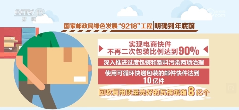 2023年年底前,按照國家郵政局實施的綠色發(fā)展“9218”工程要求,電商快件不再二次包裝比例將達到90%,深入推進過度包裝和塑料污染兩項治理,使用可循環(huán)快遞包裝的郵件快件達到10億件,回收復用質(zhì)量完好的瓦楞紙箱8億個。