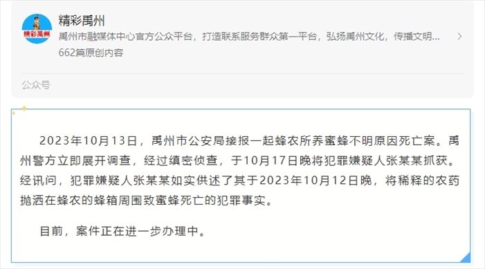 ·河南禹州警方通報“蜂農(nóng)60箱蜜蜂遭投毒死亡”:已抓獲嫌疑人。