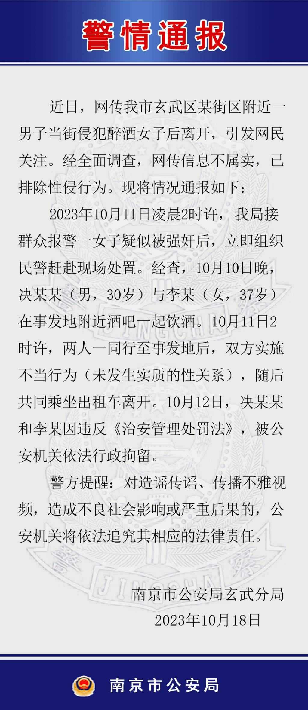·南京警方通報網(wǎng)傳男子當街侵犯女子:排除性侵,二人被行拘。