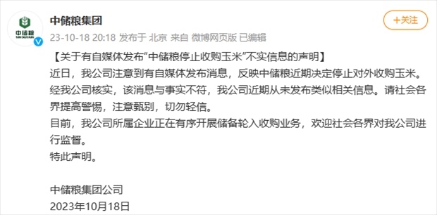 ·中儲(chǔ)糧集團(tuán)辟謠停止收購(gòu)玉米:近期從未發(fā)布類似相關(guān)信息。