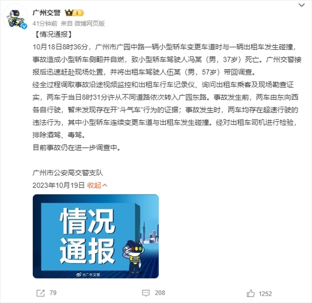 ·廣州交警通報(bào)寶馬車與出租車發(fā)生碰撞后撞上橋墩起火、駕駛?cè)怂劳鍪录簝绍嚲佟⑽窗l(fā)現(xiàn)開(kāi)“斗氣車”。出租車所屬公司發(fā)聲:司機(jī)已盡力剎車,但確實(shí)存在超速。