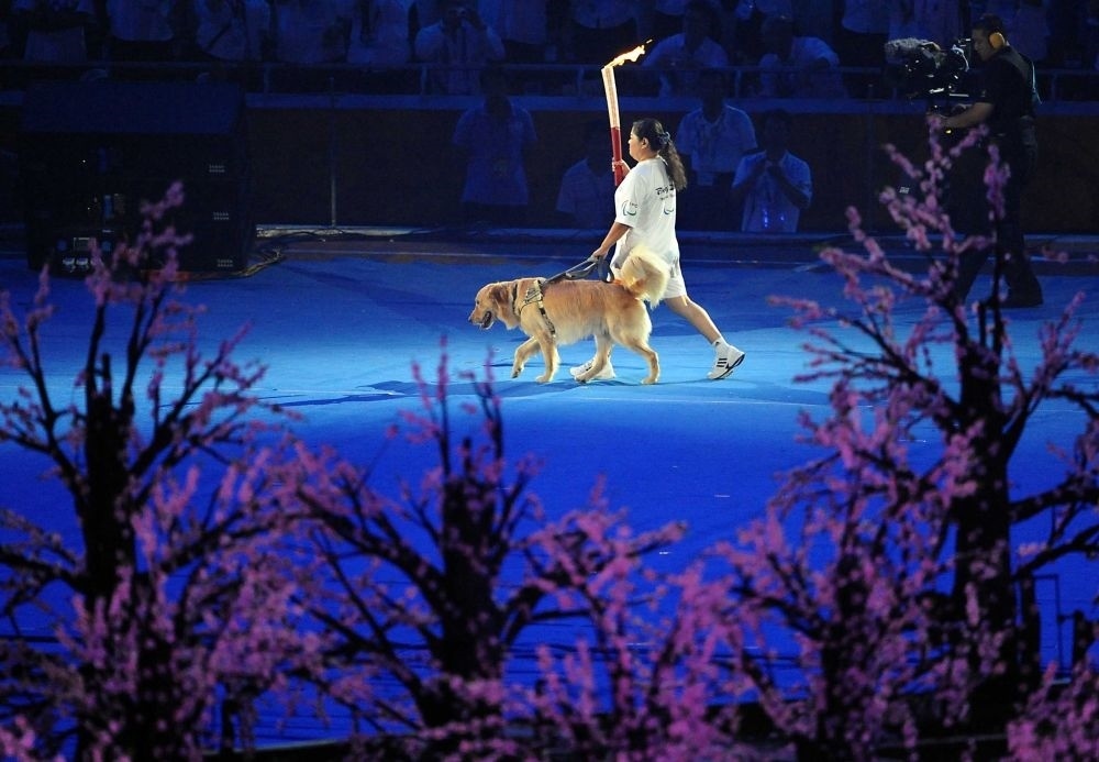 2008年9月6日,北京2008年殘奧會(huì)開幕式在國家體育場(chǎng)隆重舉行,火炬手平亞麗在進(jìn)行火炬?zhèn)鬟f。新華社記者王頌攝