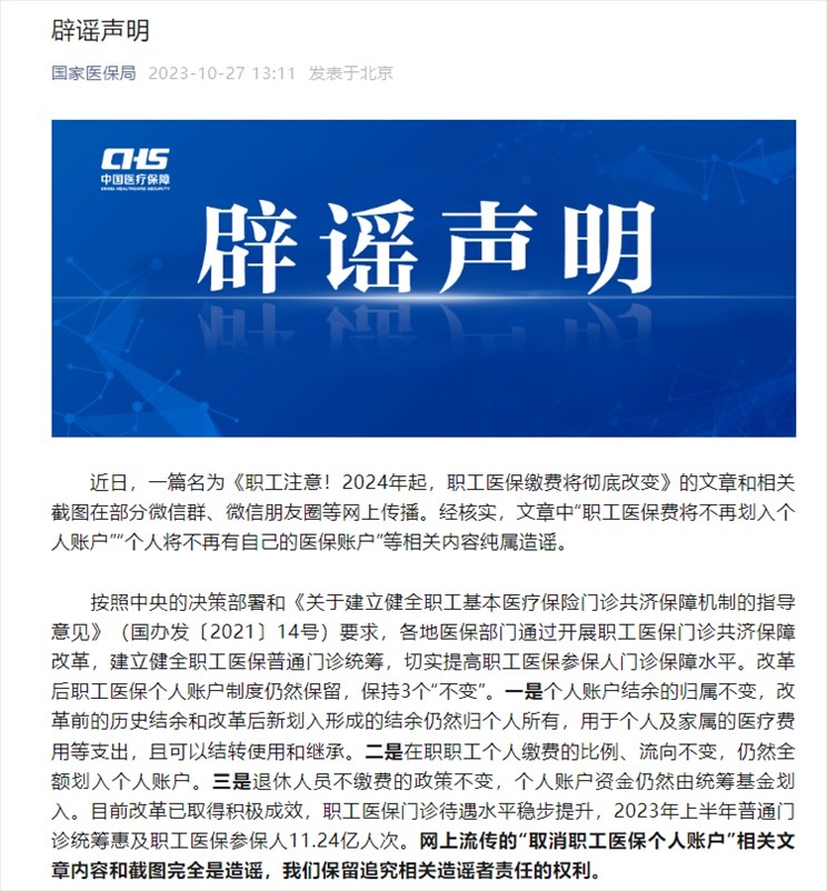 ·“職工醫(yī)保費(fèi)將不再劃入個(gè)人賬戶”“個(gè)人將不再有自己的醫(yī)保賬戶”?國家醫(yī)保局:純屬造謠。