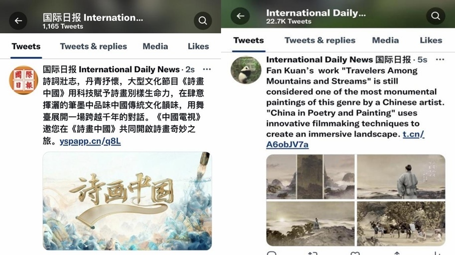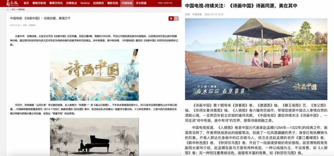 同時(shí),《詩(shī)畫中國(guó)》在傳播上也達(dá)到了節(jié)目?jī)?nèi)外的同頻共振,成功讓華夏文明輻射至全世界。在美國(guó)《國(guó)際日?qǐng)?bào)》網(wǎng)站和社交媒體賬號(hào)、法國(guó)《歐洲時(shí)報(bào)》網(wǎng)站和App、俄羅斯《龍報(bào)》網(wǎng)站和世界頭條App“北極熊視野”賬號(hào)等華文新媒體平臺(tái)上,節(jié)目相關(guān)內(nèi)容廣受歡迎。在2022“非洲伙伴”媒體合作論壇上,《詩(shī)畫中國(guó)》還作為總臺(tái)優(yōu)秀作品進(jìn)行了展示。日前于戛納影節(jié)宮舉辦的第六屆WISDOM in CHINA中國(guó)原創(chuàng)節(jié)目模式推介會(huì)上,節(jié)目更是以中國(guó)原創(chuàng)之名,登上了Mipcom主舞臺(tái)。