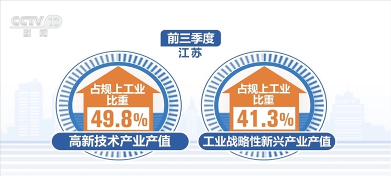江蘇省今年以來不斷壯大先進(jìn)制造業(yè)規(guī)模,前三季度,江蘇省高新技術(shù)產(chǎn)業(yè)、工業(yè)戰(zhàn)略性新興產(chǎn)業(yè)產(chǎn)值占規(guī)上工業(yè)比重分別為49.8%、41.3%,比上半年均有提升。前三季度,新能源汽車、充電樁產(chǎn)量分別增長80.2%和1.1倍。