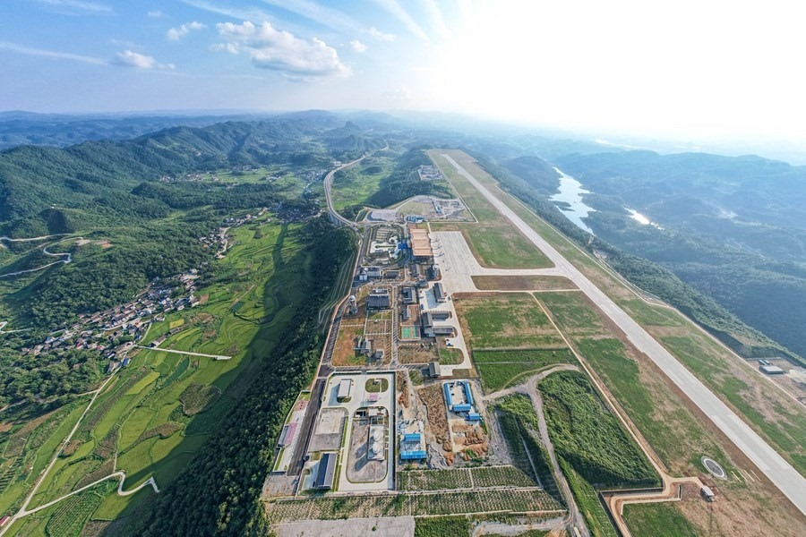 這是8月17日在湖南省湘西土家族苗族自治州花垣縣花垣鎮(zhèn)老天坪村拍攝的湘西邊城機(jī)場(chǎng)(無人機(jī)照片)。新華社記者 陳思汗 攝