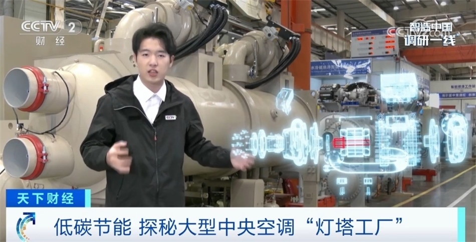 總臺(tái)央視記者 吳柏辰:今天我們來(lái)到的是位于山東青島的一家生產(chǎn)中央空調(diào)的“燈塔工廠”,這里生產(chǎn)的空調(diào)跟我們平時(shí)家用的不一樣,我身邊這樣的大家伙就是一臺(tái)商用中央空調(diào)的主機(jī)。要知道一棟寫(xiě)字樓或者商場(chǎng),空調(diào)制冷和制熱的能耗往往能能夠占到整體能耗的60%以上。這種大型空調(diào)如何用最少的電獲得最大的制冷或制熱效果?關(guān)鍵就在于空調(diào)主機(jī)的壓縮機(jī),我們可以看到在這臺(tái)空調(diào)頂端的這個(gè)白色裝置氣懸浮壓縮機(jī),它采用的就是一種空氣動(dòng)力學(xué)技術(shù)。就像我們熟知的飛機(jī)機(jī)翼通過(guò)上下空氣流動(dòng)的速度不同所產(chǎn)生的浮力,它就運(yùn)用了同樣的原理。