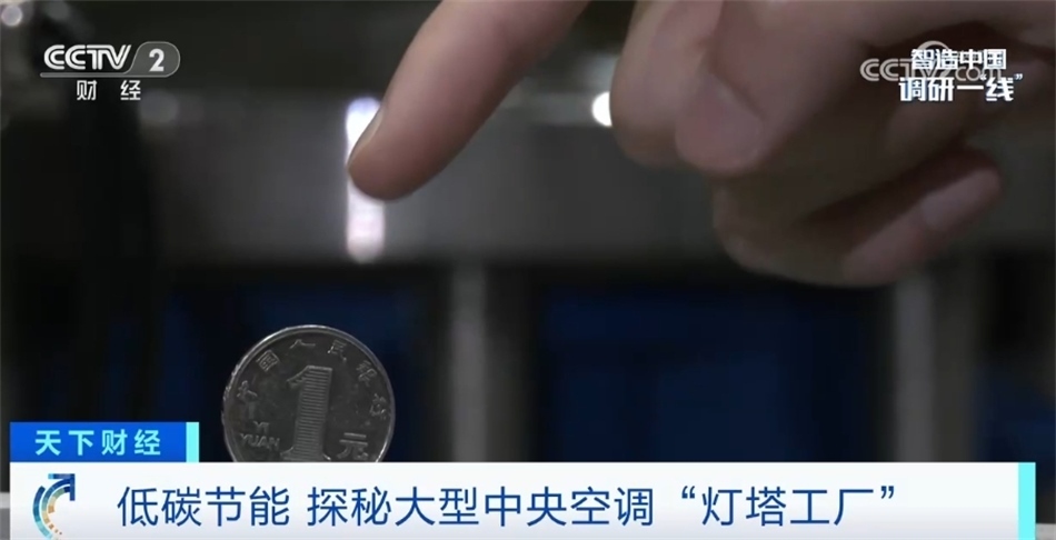 我現(xiàn)在走進(jìn)的這個(gè)區(qū)域是空調(diào)產(chǎn)線的末端——檢測(cè)平臺(tái)。每一臺(tái)空調(diào)出廠前都要在這里經(jīng)過(guò)全方位的檢測(cè)。眼前這就是一臺(tái)正在運(yùn)轉(zhuǎn)的氣懸浮中央空調(diào),我們?cè)诳照{(diào)上立了一枚硬幣,可以看到是紋絲不動(dòng)的,這也是氣懸浮的特點(diǎn)之一——運(yùn)行比較平穩(wěn)。在這塊屏幕上顯示著空調(diào)的出水溫度7℃,恒定的出水溫度讓這臺(tái)空調(diào)產(chǎn)生的冷風(fēng)非常柔和。目前,這座工廠全流程的自動(dòng)化生產(chǎn)能夠滿足從小型商用空調(diào)生產(chǎn)到用戶(hù)需求的大規(guī)模定制。目前低能耗、智能化產(chǎn)品已應(yīng)用在商業(yè)地產(chǎn)、酒店、軌道交通等各種場(chǎng)景,極大程度助力著國(guó)家“雙碳”政策以及各大行業(yè)的低碳轉(zhuǎn)型。